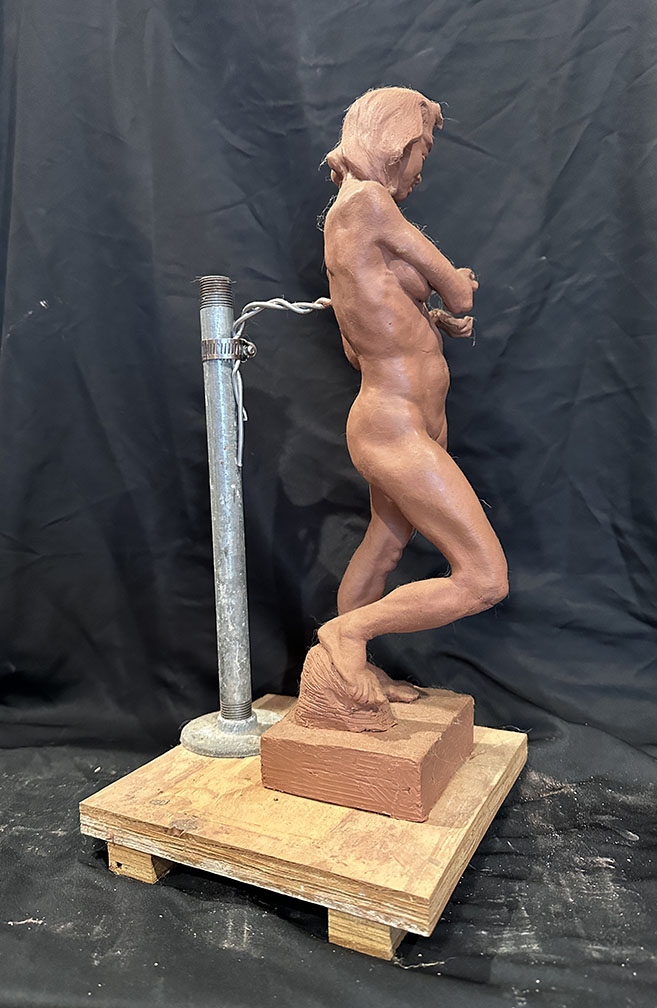 (2) Wire free armature (to be fired, 18-20″ scale figure): Tom’s armature design consists of a 1/2″ diameter pipe, 10 to 12″ in length, attached with a flange to a 3/4″ thick wood base with dimensions of 12 x 12” to 18 x 18”, “feet” are attached to the bottom of the board so you can easily lift your piece. Bring wood skewers to also support clay. If you don’t want to make your own wire free armature, you can purchase one from Paul for $65 (painted board w/ feet, flange, pipe). Students working without a wire armature can fire their finished piece at our neighbors pottery studio for a very small firing fee.