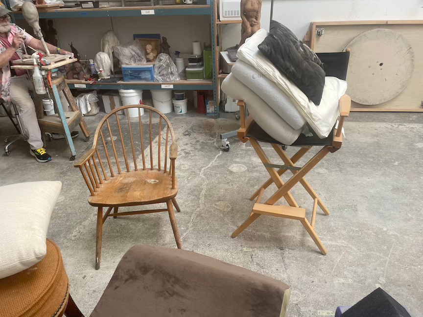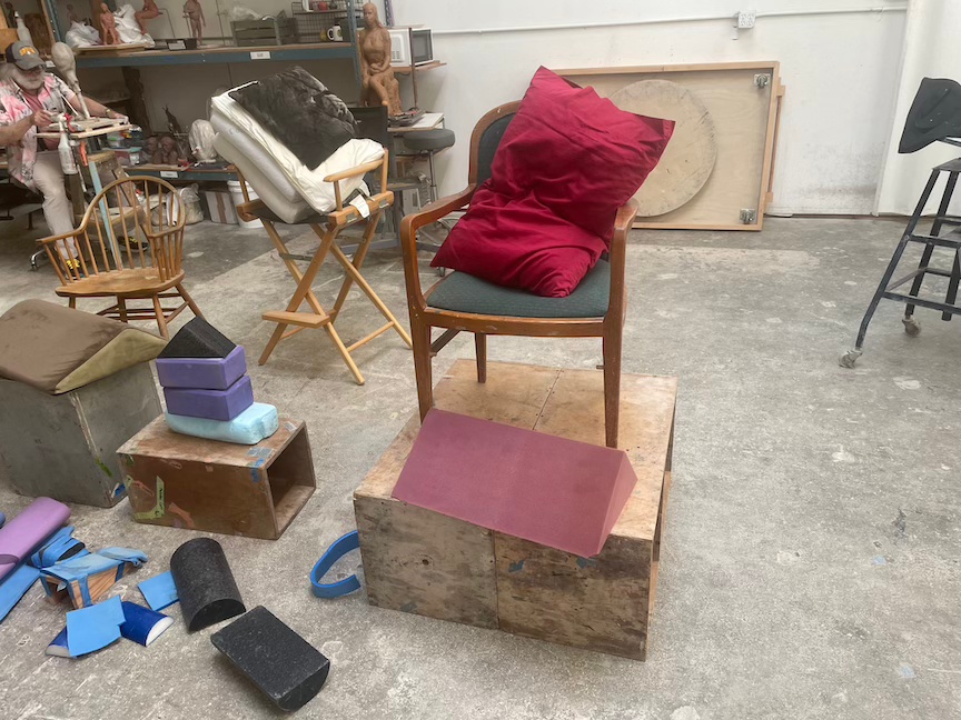 Below are various chairs, blocks, pillows, yoga pads, poles, etc. that we have at the studio to use for a given pose. Please bring or request any pose aids that you do not see here.